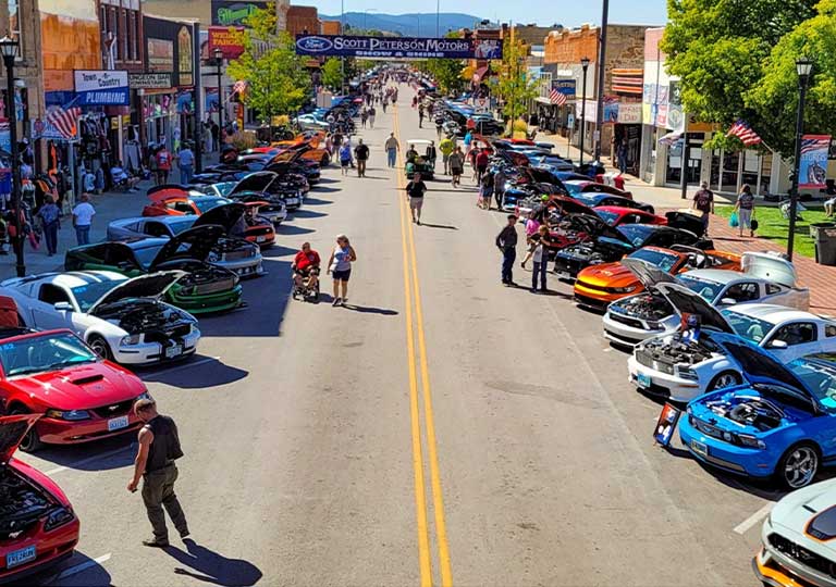 Mustangs parked along the street in Sturgis, SD.